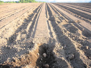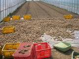 | じゃがいもは、種を蒔きません。 いもを植えます。 家では、出荷の際に選別をしますが、その時にハネられたものが、種イモになります。 ですから、小さいものや、キズついたもの、変形等々、でもそれだけでは足りないので、40〜60g位のいもも、たね用として、よけておきます。 |