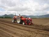 ![]() jジャガイモの植え付けは、機械です。 お世話になってる坂東さんに毎年借りてます。 まずよく洗浄します。 ![]() 後ろに2人が乗って、種イモがひとつづつ落ちるように、手作業で調整してます。 ママの友達ありがとー ![]() こんな感じになってます。 5月19日 4日間にわたるジャガイモの植え付けが終了しました。 手伝ってくれた皆さん、ありがとうございました。(^^)v 本当に寒い日が続くなか、僕はほとんど、トラクターの上で動く事がないので、体の芯まで冷えました。 ブルブル ![]() でも、これでひと安心。 大豊作だといいな〜 |