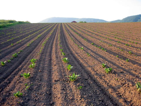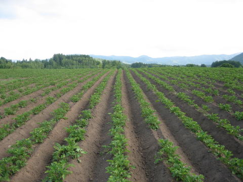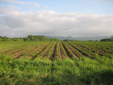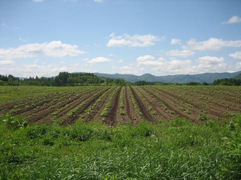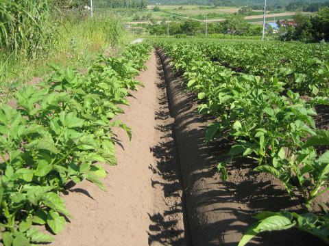 | 5月28日〜29・6月2日〜3日 ジャガイモさんの除草 ![]() カルチという機械をトラクターの後ろに付けて、ジャガイモさんの植えてある畝の間を走ります。 ![]() 写真の茶色い方がカルチを掛けたところです。 草も完璧には無くなりませんが、だいたいこれで間に合います。 ブログにも書き込みました (ブログ百姓の日々) ここ赤井川村は山間地というか、傾斜の多いところで、傾きが一方向ではなくねじれているので、カルチなどの作業も気を抜けません。 |