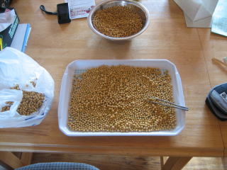 冬の仕事のひとつ、選別、豆よりをしてるところです これから、納豆になるのです。 ひとつひとつ、石や悪いのをよけていきます ここで、更に愛情がこもってます。 |
