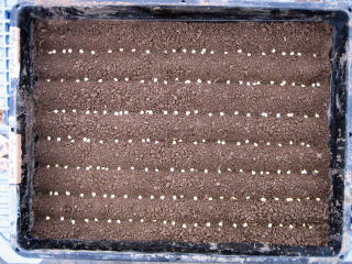 3月27日 昨年より数日早いですが、トマト、ナス、ピーマン等の種を蒔きました。 土は昨年の秋に用意しておいたものです。トマトを植えてあった株元の土です、もろ連作ですね、ちなみにトマトはこの土で4年目です。 |