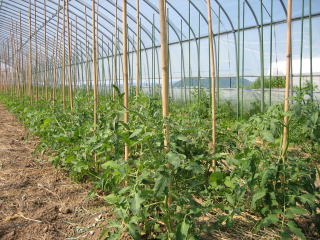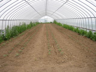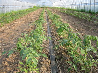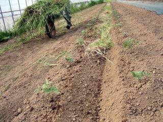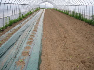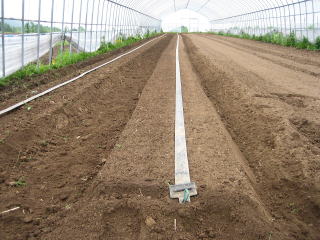 | 5月25日 ビニールハウス2号にはトマト、ナス、ピーマン、インゲンが植えられる予定です ![]() ナス、ピーマンはマルチ無しでは正直難しい、昨年実験してみましたが、切ない結果になりました、今年は断念 まず、左の写真のようにベットを作り、灌水用のチューブをセット、グリーンのマルチをピチッと敷いて。 5月26日 右の写真は定植をした状態です。 小さいので植わっているか分かりずらいですが、植わっています。 |