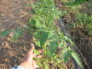 | 6月10日 灌水チューブの設置 ![]() 御覧の通り、トマトはマルチ無しです、トマトが植えてある間に溝を付け、灌水チューブが直接土に接触しまいように敷き草をしました。溝を付けたのは、水が飛び散らないようにです。 |