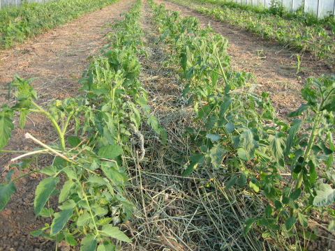 6月25日![]() 灌水チューブの上、畝の間に敷き草をしました、水分の乾燥を防ぐためです、 |